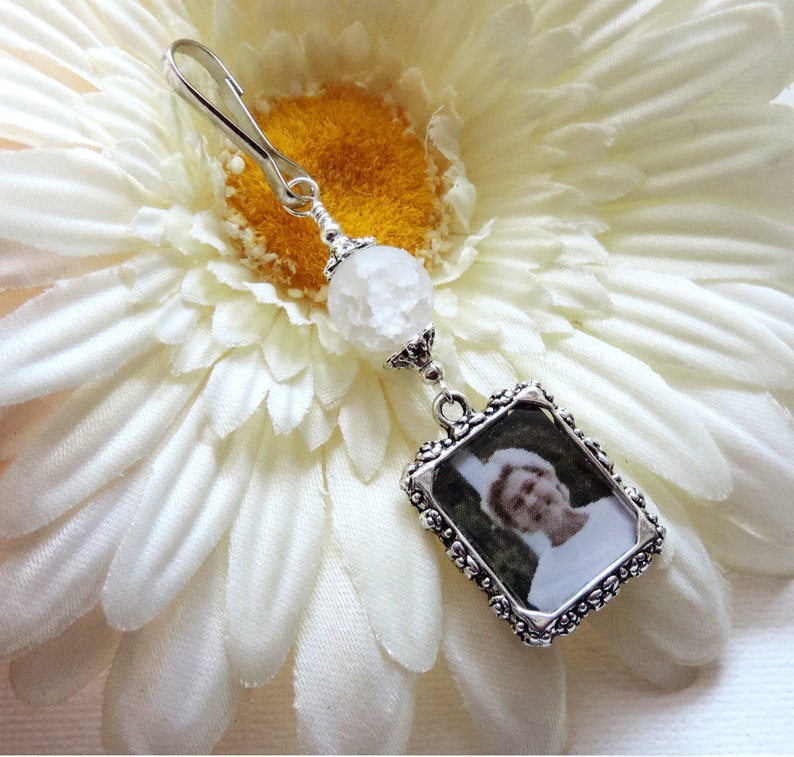 Maker of personalised memorial bouquet charms, suit & lapel pins & cufflinks. If you need help with this please contact me. Cyting wedding bouquet photo charm i know you'd be here today if heaven weren't so far away memorial photo frame keychain remembrance jewelry bridal shower gift. Loved ones will always be remembered with these beautiful keepsakes on your wedding day. Wedding bouquet charms with pictures, boutonniere pins, and more.