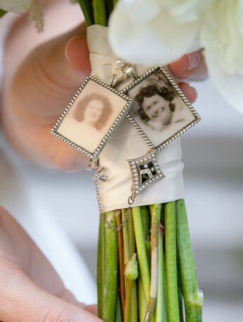 Ph pandahall 10 pack wedding bouquet photo charms double oval frame bridal charm with 20pcs angel heart wing charms, 18x25mm oval glass cabochons and jump rings. 4 pieces rhinestone photo charm round crystal photo pendants bridal wedding bouquet charms memory locket with picture necklaces lobster chains diy jewelry supplies golden silver $11.09 $ 11. Cyting wedding bouquet photo charm i know you'd be here today if heaven weren't so far away memorial photo frame keychain remembrance jewelry bridal shower gift. Make your own wedding bouquet photo charms to commemorate loved ones, sponsored by bernzomatic.get the full details here: Engrave names, a personal message or a date on the front and back of the bridal charm. Trusted source of custom gifts for 15 years. You will need to replace with your own photo before ordering/ printing. Personalized photo & handwriting wedding bouquet charms. Sunflower frame wedding bouquet charm w/ 25mm photo area $ 4.99. Photo used is a placeholder image only. If you need help with this please contact me. 4.6 out of 5 stars. This listing is for a 1x 1 1/2 rectangle.